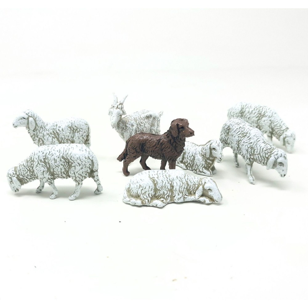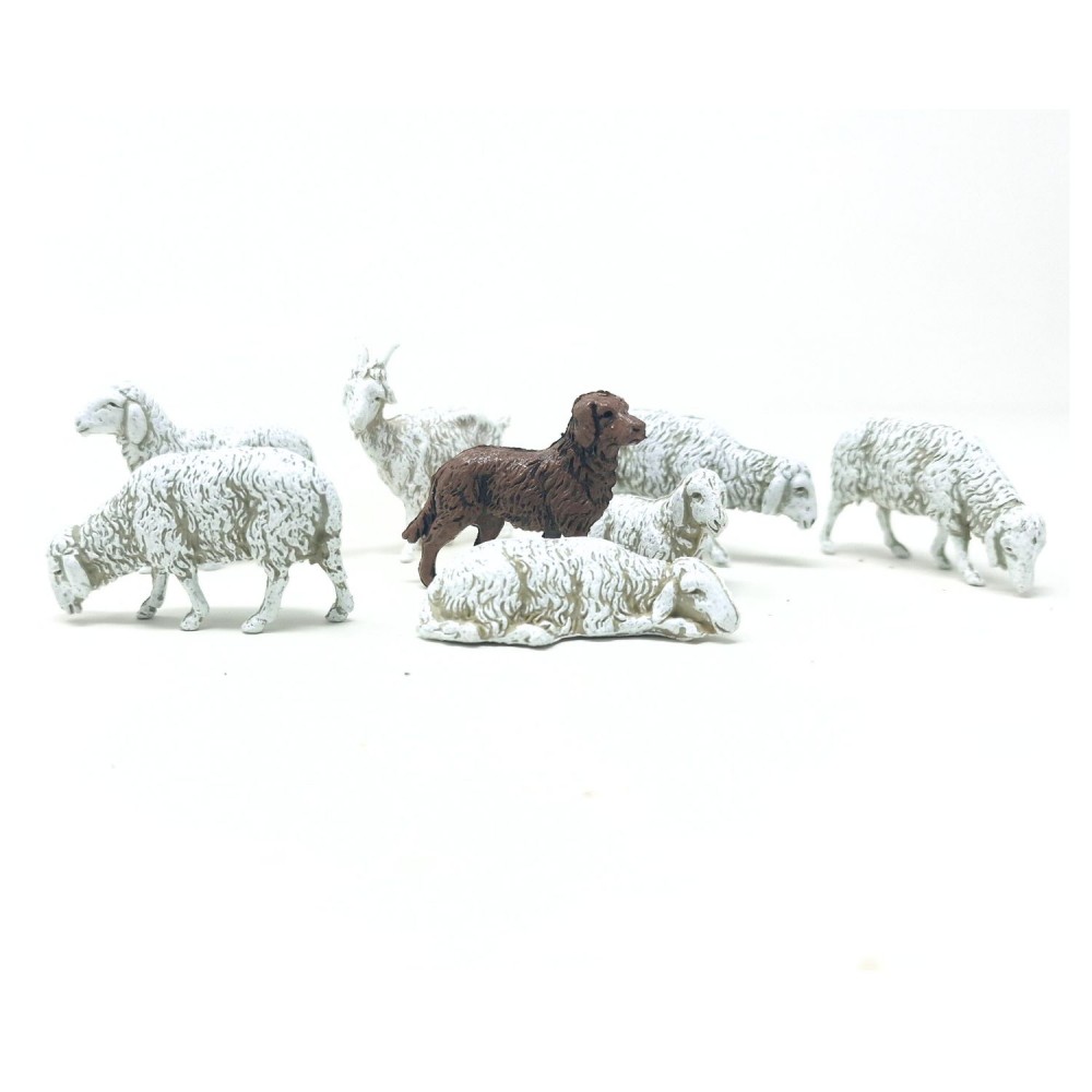 Set 8 modelli di Pecore e Capra con Cane Pastore in Miniatura per Presepe. Realizzate in Plastica. Dimensioni: 10 cm circa.