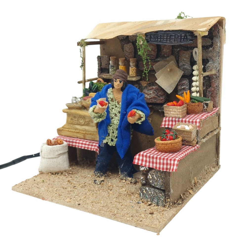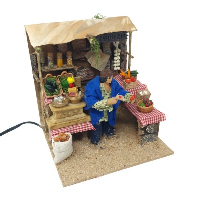 Scena ricca di elementi, il personaggio tiene in entrambe le mani due ortaggi, sparse per tutta la scena diversi tipi di ortaggi tutti realizzati in terracotta e dipinti a mano, alle spalle del pastore c'è un cartello e in basso un paniere pieno di ortaggi.