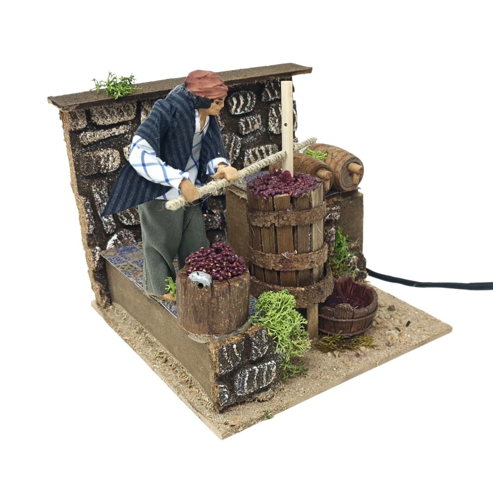 Nella scena il pastore in movimento lavora al torchio, ai suoi piedi è presente una bacinella dove sgorga il vino prodotto. Scorcio artistico di vita rurale per impreziosire il tuo presepe.