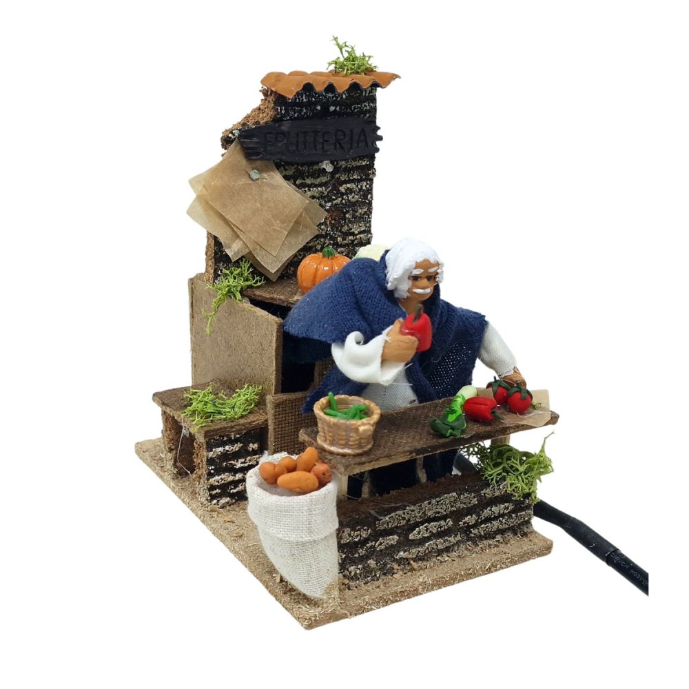 Scena ricca di elementi, il personaggio tiene in entrambe le mani due ortaggi, sparse per tutta la scena diversi tipi di ortaggi tutti realizzati in terracotta e dipinti a mano, alle spalle del pastore c'è un cartello e in basso un paniere pieno di ortaggi.