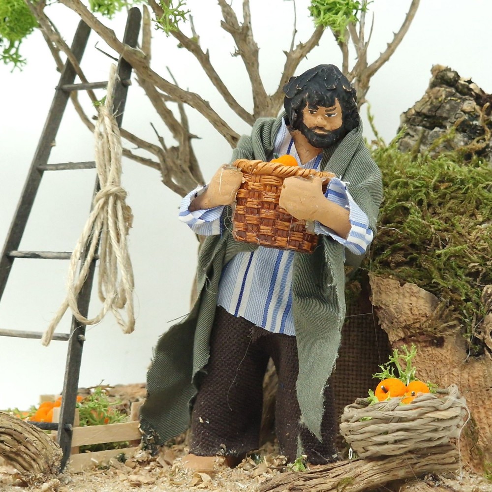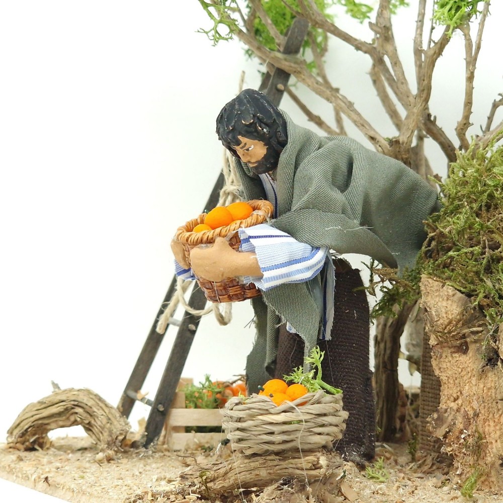 Questo elemento per presepe raffigura un uomo che raccoglie le arance. Scorcio artistico di vita rurale per impreziosire il tuo presepe.
